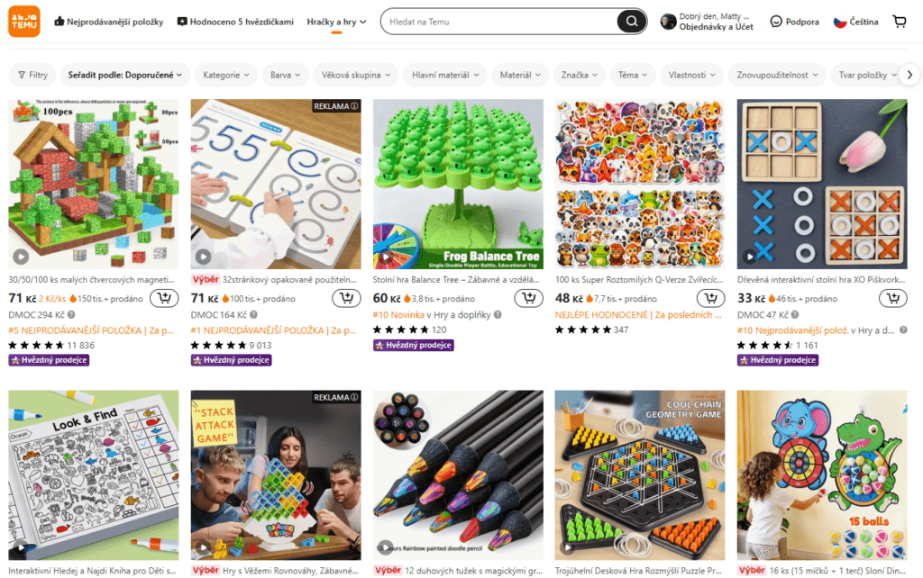 Pro snadnou orientaci v takto široké nabídce hraček z Temu slouží nejrůznější kategorie a filtry. Dokonce si lze vybrat i věkovou skupinu, pro kterou má být hračka určena. Díky tomu zákazníci rychle najdou přesně to, po čem jejich děti touží.